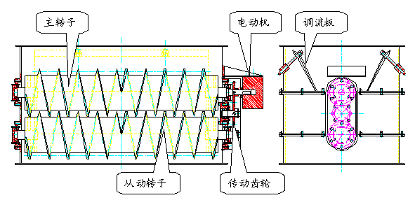 均勻分布煤流的關(guān)鍵零部件是一個(gè)帶不同旋向絞籠的主轉(zhuǎn)子,不同旋向的絞籠從主轉(zhuǎn)子的中心線向主轉(zhuǎn)子的兩頭延伸,在設(shè)備的旋轉(zhuǎn)過程中使集中落到主轉(zhuǎn)子中部的煤流隨著絞籠均勻分布到整個(gè)主轉(zhuǎn)子方向,達(dá)到均勻布料的效果。